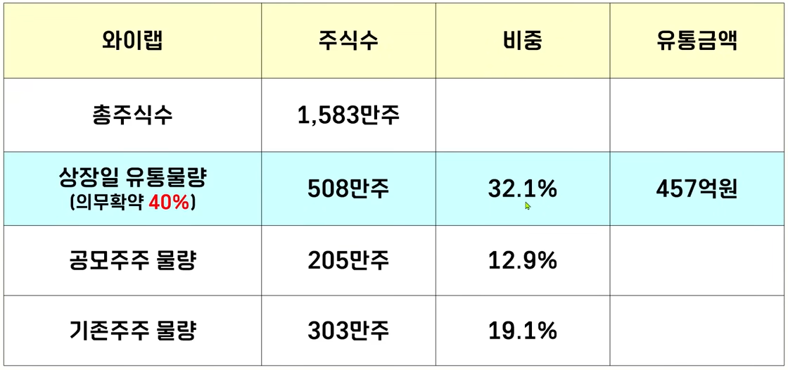 와이랩은 목요일에 상장을 하고 청약 주관사는 한국투자증권이었습니다. 이 종목은 최종배정에서 의무확약 비율이 40%로 크게 늘어났습니다. 수요 예측에서 14.7%이었으니까 약 2.5배에 늘어나게 되었는데요 좋은 결과입니다.