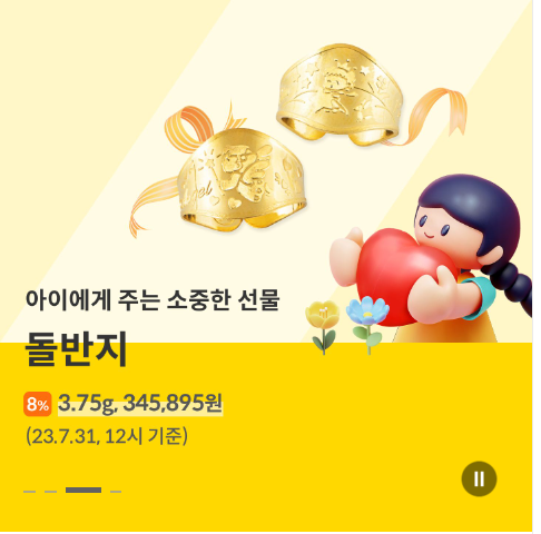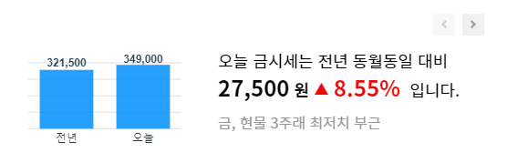 오늘의 금시세 돌반지 1돈 가격 정보입니다. 위 돌잔치 참석시 고려할 선물유형 조사표에서 아실 수 있듯이 돌반지 가격이 너무 올라 부담스럽습니다. 최근에는 조금 하락하여 30만 원 후반대를 유지하고 있어요. 돌반지 1돈 이외에 조금 부담이 덜한 선물이 될 수 있는 1g 돌반지 가격도 정리하였습니다. 아래 실물 사진과 함께 가격 알아보세요.