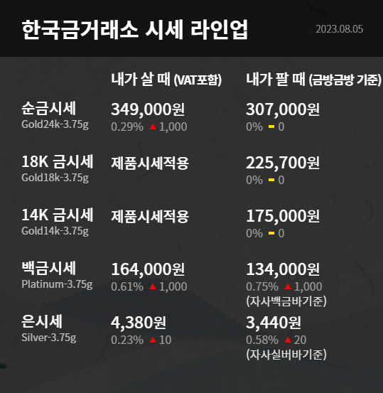 .2023년 8월 7일 오늘의 금시세 금 1돈 가격 한국 금거래소 기준 가격입니다. 순금시세 1돈 3.75g 기준 내가 살 때(VAT포함) 349,000 원 전일대비 1,000원 올랐습니다. 내가 팔 때 307,000 원입니다.