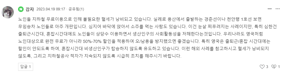 - 무임 적용 : 보호자 동반 만 6세 미만 영·유아 3인까지(보호자는 일반인 요금 지불) - 상이국가유공자는 2023년 1월 1일부터 정상 요금으로 이용 후 국가보훈부로부터 별도 비용 보조 방식으로 변경