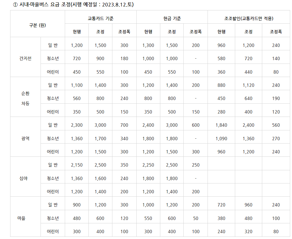 2천500원, 마을버스 천200원으로 조정된다고 밝혔습니다. 인상 폭은 간·지선버스와 순환·차등버스, 마을버스는 300원씩이고 광역버스는 700원, 심야버스는 350원입니다.