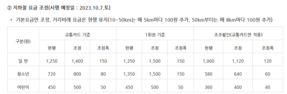 (☎1644-0088)에서 가능하다. 서울 지하철 기본요금은 10월 7일부터 1천250원(교통카드 기준)에서 1천400원으로 150원 인상된다. 지하철 요금은 내년 하반기에 150원 더 오른 1천550원이 된다. 서울의 대중교통 요금 인상은 2015년 6월 이후 8년 1개월 만이다