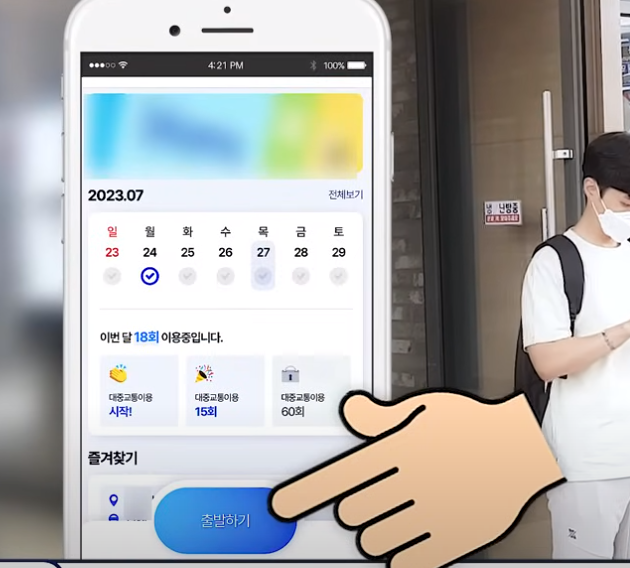 이렇게 여러분들이 외출하기 전에 집에서 알뜰 교통카드 앱을 실행해서이 출발 버튼을 클릭하고 평소처럼 지하철역이나 버스 정류장까지 걷거나 자전거로 이동합니다.