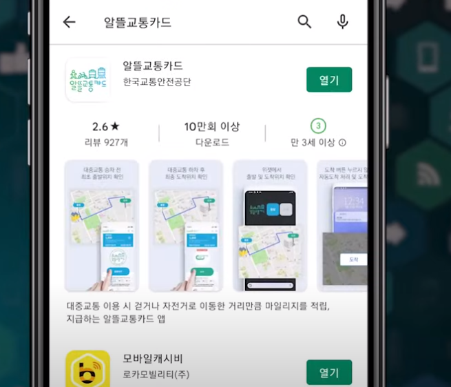 마지막으로 마일리지 전용 어플을 사용해야 마일리지를 적립받을 수가 있는데요 앱을 설치하는 방법은 먼저 구글 스토어나 앱스토어에서 알뜰 교통카드를 검색해 주세요.