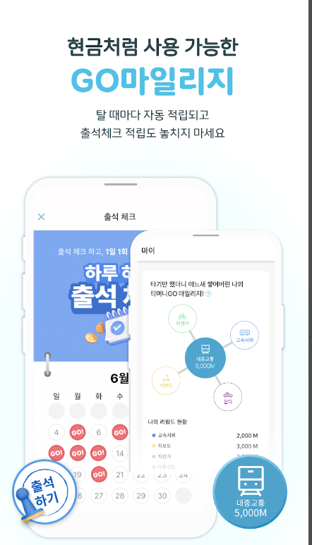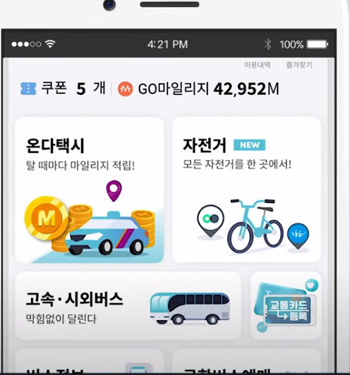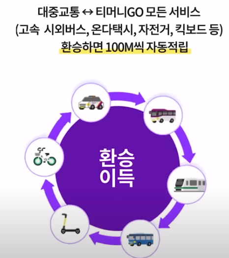 게다가 다른 교통수단으로 환승만 해도 100 마일리지씩 적립돼서 최대 만원까지 쌓이는데요.. 이 마일리지는 현금처럼 사용할 수 있는데 예를 들어 티머니고 앱에 있는 온 더택시를 이용할 때나 고속 시외버스를 탈 때도 이 마일리지를 현금처럼 사용할 수 있습니다.
