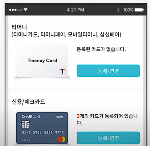 예를 들어 신용 체크카드를 누르면 이렇게 카드사 선택 화면이 나오고요 그 다음 카드 번호까지 입력하면 등록은 끝나니까 평소 대중교통을 많이 타는 분들은 잘 활용해서 교통비 절약하면 좋을 것 같습니다.