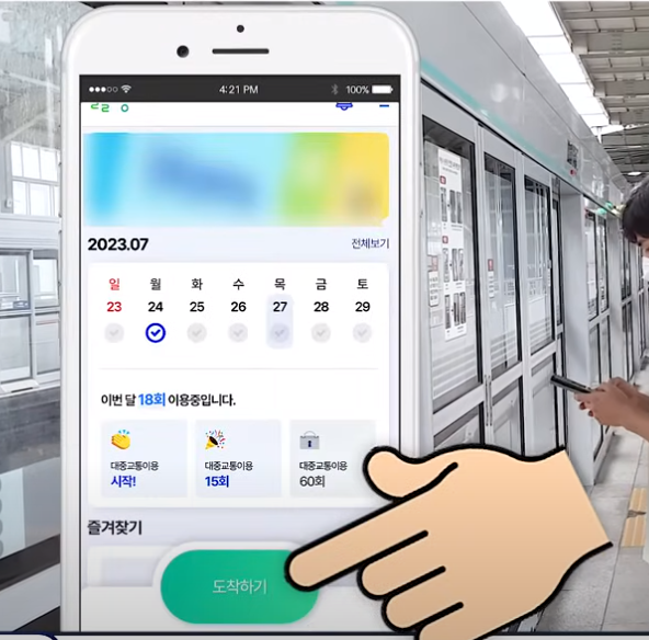 이렇게 여러분들이 외출하기 전에 집에서 알뜰 교통카드 앱을 실행해서이 출발 버튼을 클릭하고 평소처럼 지하철역이나 버스 정류장까지 걷거나 자전거로 이동합니다.