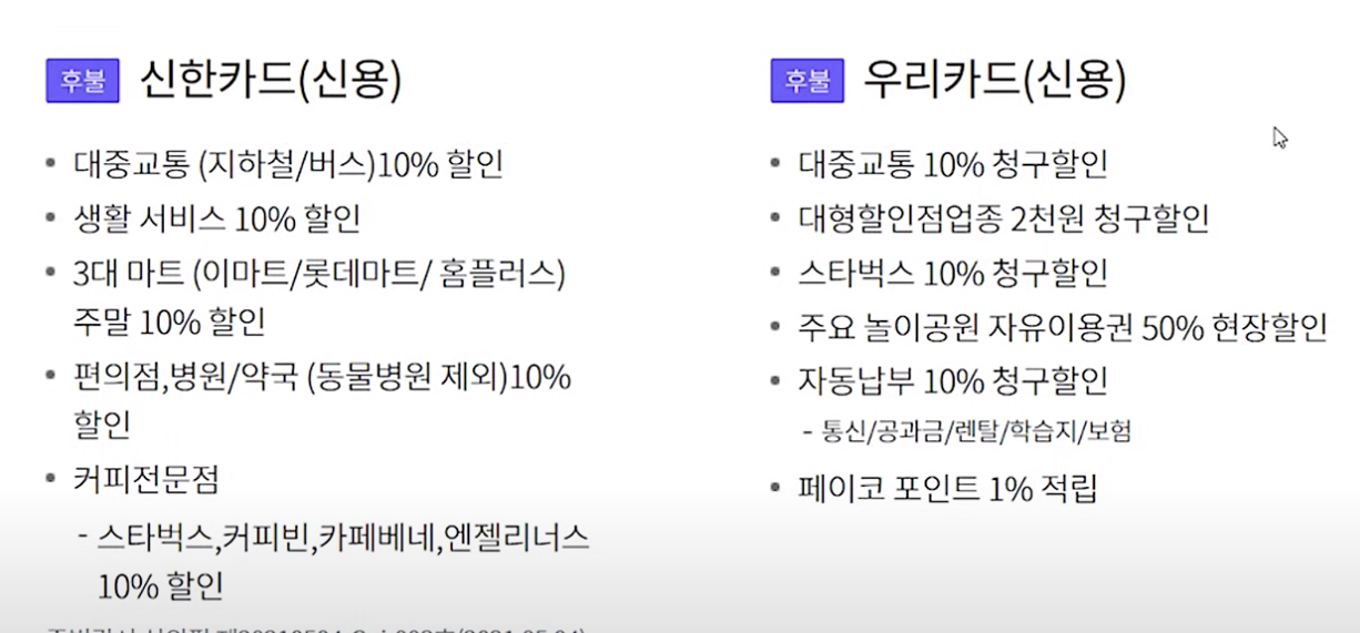 근데 카드사별로 그리고 신용카드와 체크카드 모두 추가 할인 혜택들이 다르고 또 신용카드의 경우는 연회비를 내야 되기 때문에 여러분들께서 어떤 카드가 괜찮을지 한번 읽어보고 신청하면 좋습니다.