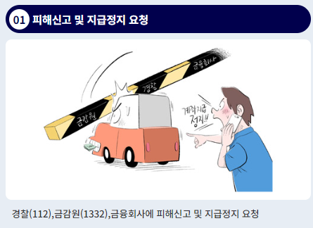 1. 입금 금융회사 또는 송금 금융회사콜센터에 즉시 전화하여 피해신고 및 계좌 지급정지* 신청 (경찰청 112 및 금감원 1332에서도 연결 가능) * 본인 거래 금융회사에서 본인의 모든 계좌