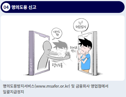 금감원 개인정보 노출자 사고예방시스템 (pd.fss.or.kr) 접속 이용약관, 개인정보제공 등 동의 후 휴대전화 인증으로 본인 확인 개인정보 노출사실을 등록하여 신규계좌 개설, 신용카드 발급 등 제한 본인 계좌 지급정지(일괄 또는 부분) 신청(다른 휴대전화 및 PC 사용을 권장)