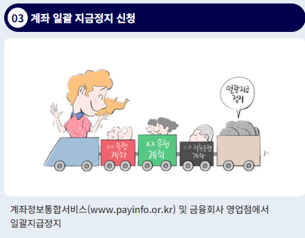 지급정지를 신청할 계좌를 선택 후 지급정지 신청 영업점을 방문하거나 콜센터(전화)를 통해서도 지급정지 신청 가능