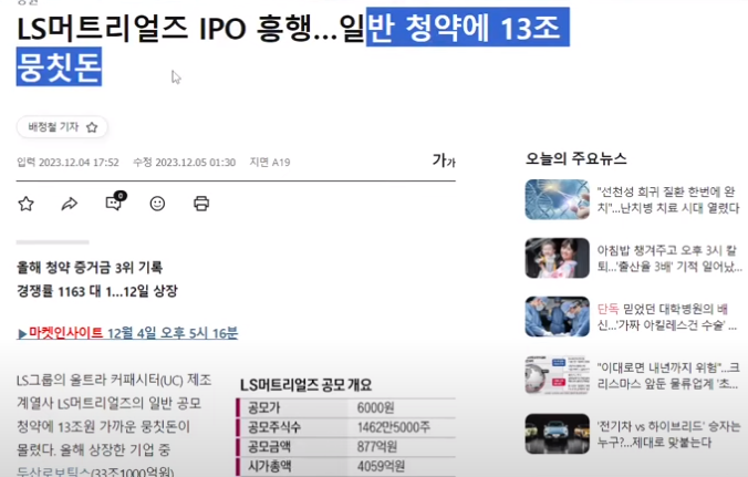 2023년 IPO 시장의 마지막 화려한 피날레를 장식할 LS머트리얼즈에 주목하세요. 이 회사는 친환경 에너지와 알루미늄 소재‧부품 분야에서 성장세를 보이고 있는 LS전선의 자회사로, 2022년에는 매출액과 영업이익이 각각 280%, 470% 증가했습니다. 올해 10월까지의 매출액은 이미 114억 원에 달하고 있습니다.