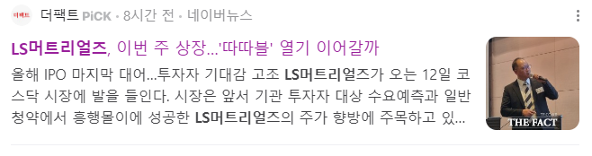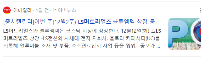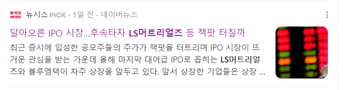 2023년 IPO 시장의 마지막 화려한 피날레를 장식할 LS머트리얼즈에 주목하세요. 이 회사는 친환경 에너지와 알루미늄 소재‧부품 분야에서 성장세를 보이고 있는 LS전선의 자회사로, 2022년에는 매출액과 영업이익이 각각 280%, 470% 증가했습니다. 올해 10월까지의 매출액은 이미 114억 원에 달하고 있습니다.