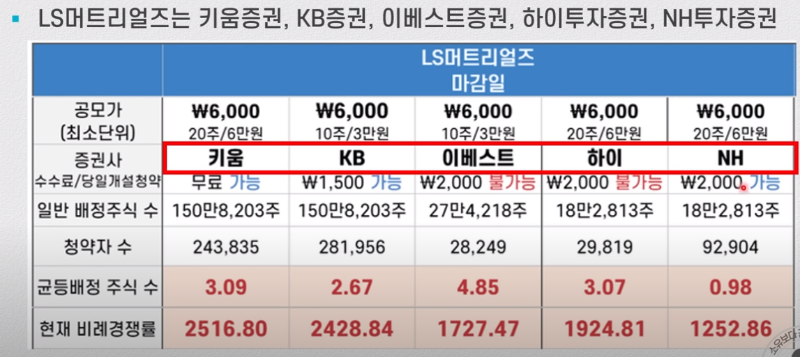 LS머트리얼즈의 상장일은 12월 12일 화요일이며, 상장 후 예상 시가총액은 공모가 상단 기준 3,721억 원입니다. 주관사 별 배정 물량은 키움증권과 KB증권에 82.5%가 몰려 있습니다.