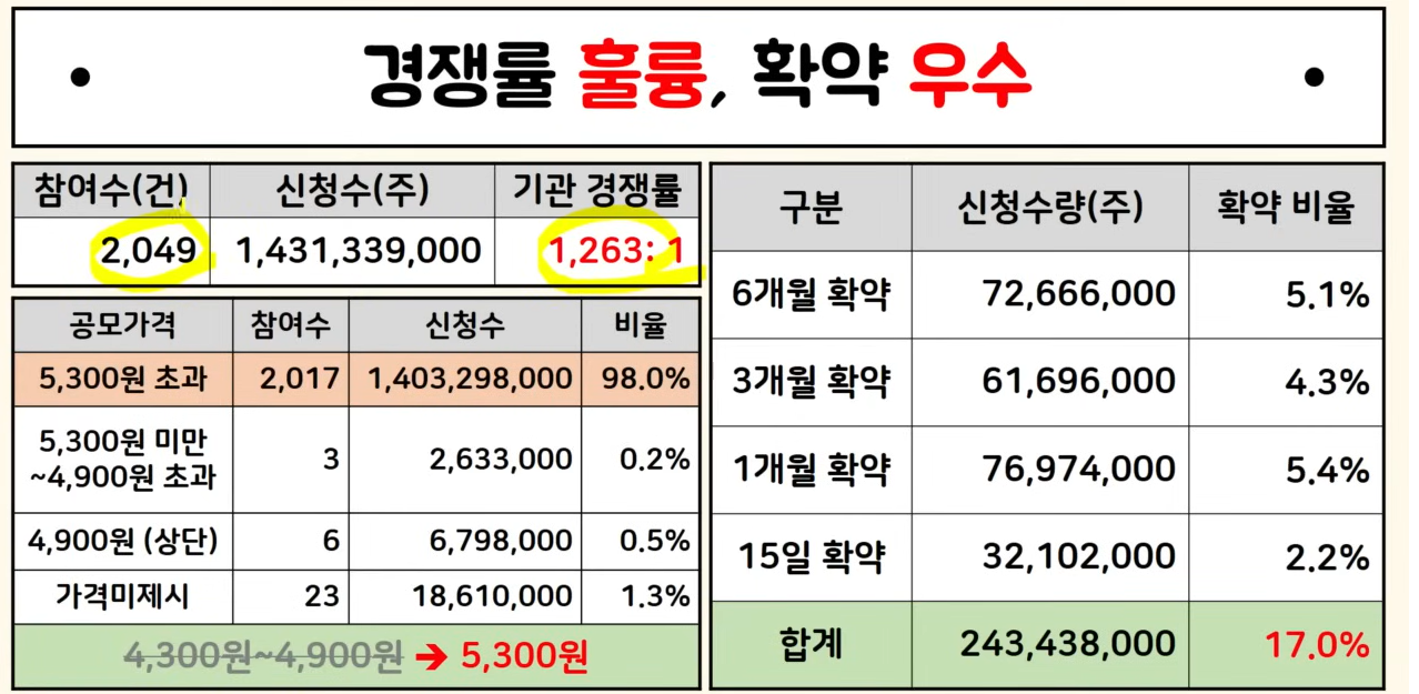 그리고 가격도 밴드 상단이 4,900원 단 0.5%에 불과하고 나머지 모두 상단을 초과했습니다. 확정가격이 5,300원인데 이걸 초과한 비율도 98%나 되고요.. 그래서 가격 메리트가 상당하다고 볼 수 있습니다.