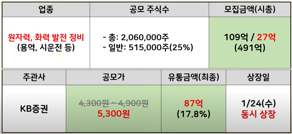 주관사 KB, 공모가는 상단 초과한 5,300원 확정이 됐네요. 또 유통 금액은 87억인데 스펙 주 정도 수준으로 매우 작기 때문에 수급상 매우 유리할 수 있습니다. 상장은 1월 24일 수요일인데 대신스펙과 상장이 겹쳤습니다.