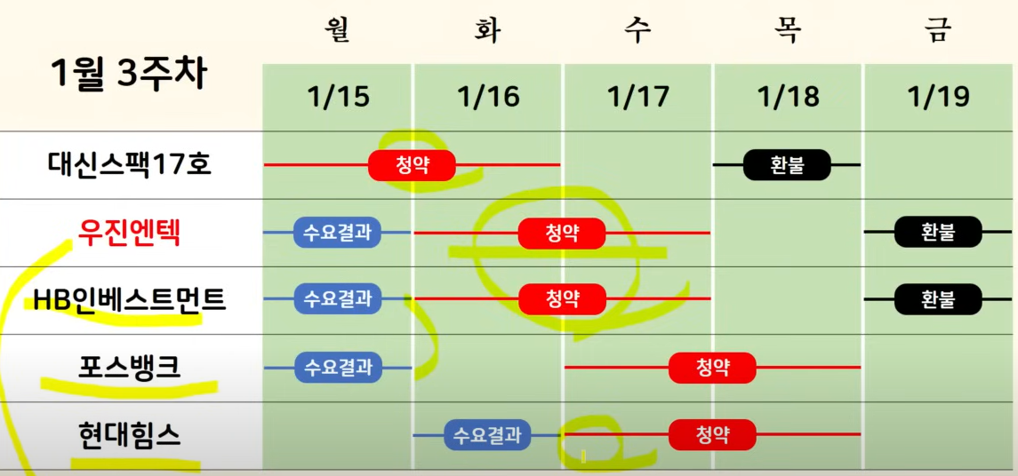그러면 이렇게 좋은 결과가 나왔는데 아쉬운 건 청약일정이 많이 겹친 거예요 앞서 언급드린 것처럼 대신스펙을 청약하게 되면 이후 포스뱅크 현대힘스 때 환불을 받아서 활용이 가능한데 우진엔텍 HB 인베스트먼트 하게 된다면 자금이 넉넉한 분들이 아니면 배분이 어려울 수 있습니다. 대신스펙도 규모가 작고 수요예측이 무난하게 나왔기 때문에 역시 상장일 수급이 기대가 되는 상황이라서 매우 어렵습니다.
