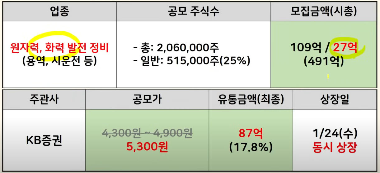 공모내역도 간단히 보겠습니다. 우진엔텍은 원자력 화력 발전 정비 사업을 하는 곳이고요 일반 청약자에게 27억 모집을 합니다. 매우 작은 규모고 시총은 491억 입니다.
