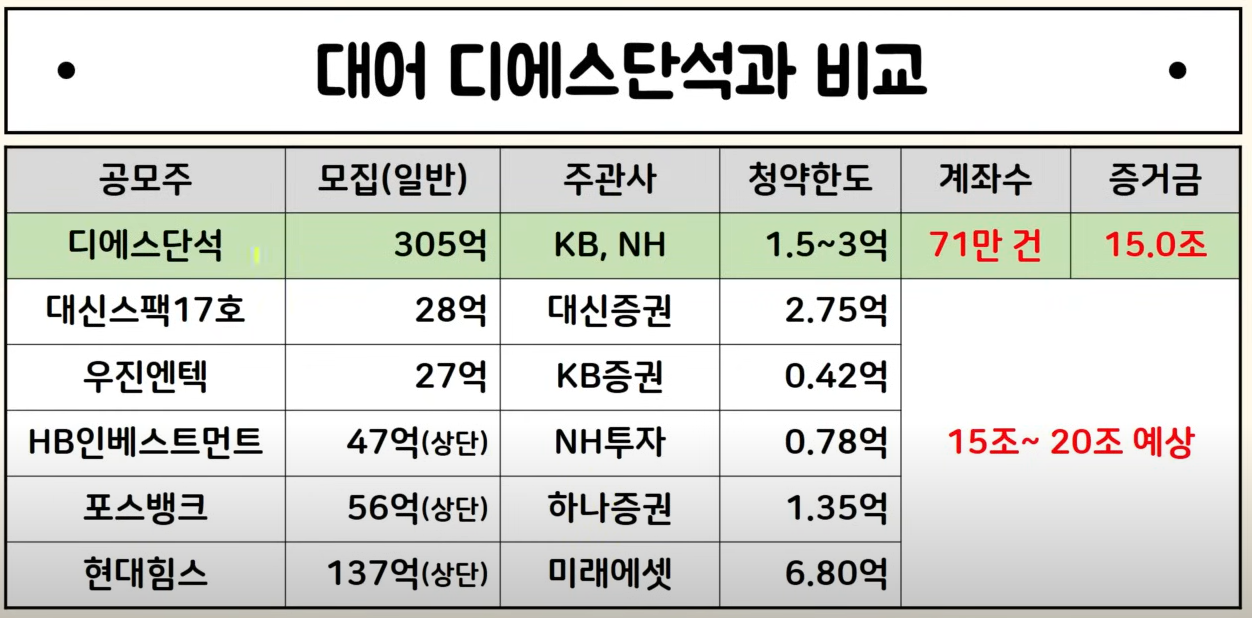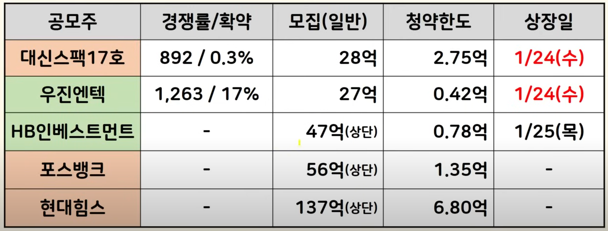 그리고 상장 일정은 우진과 대신 24일로 겹쳤고 나머지 세 곳도 동시 상장 가능성 높아요 이것도 고려를 해 봐야 되고요 기사로 보면 HB와 현대힘스도 좋은 결과가 나온 거 같은데 그럼 대신스펙과 현대힘스를 택하거나 우진과 HB 현대힘스를 같이 배분하고 뭐 이런 시나리오로 들어가야 될 것 같습니다.