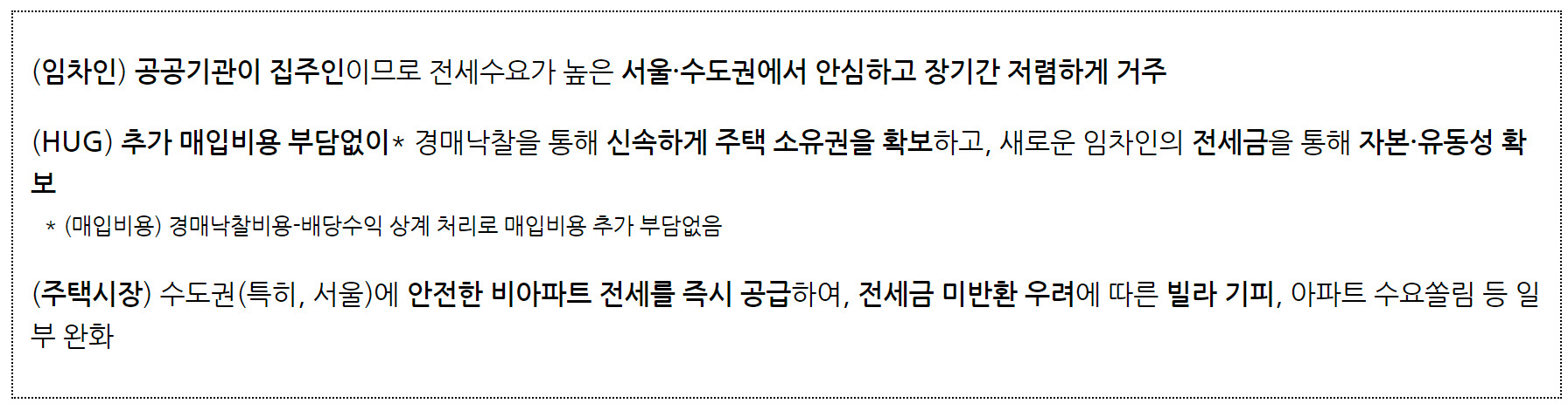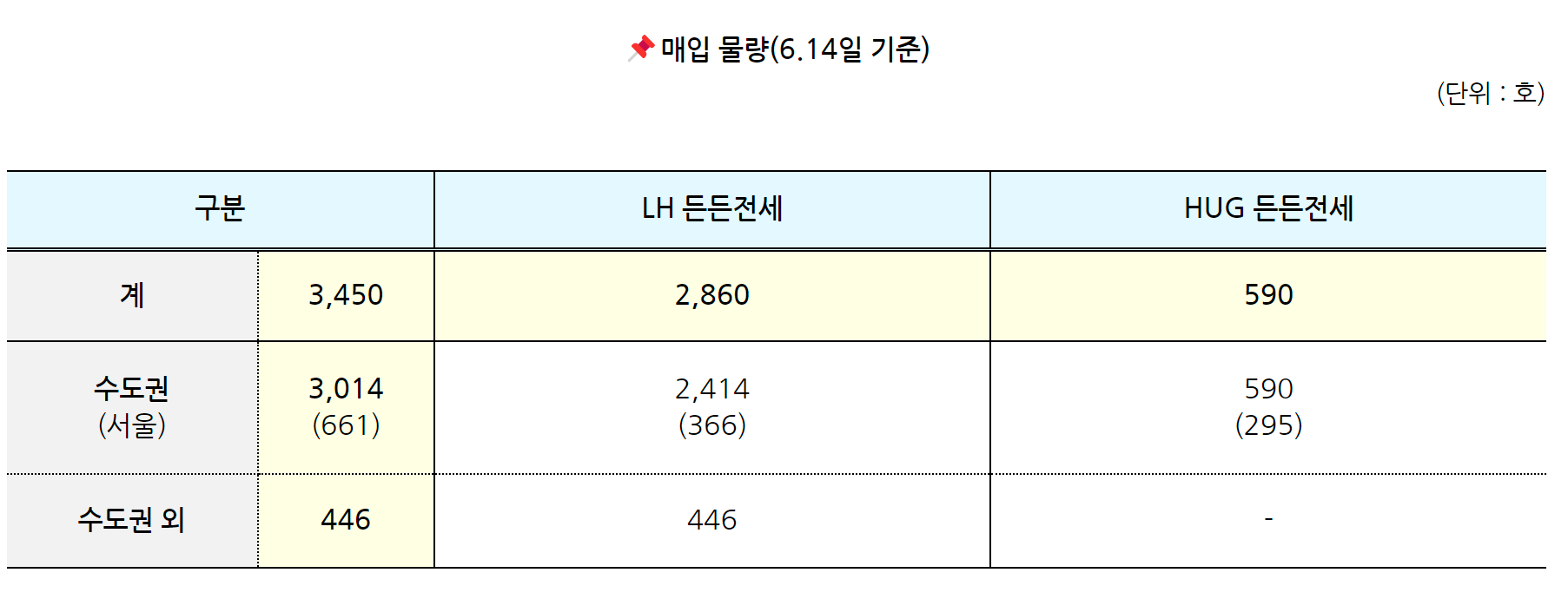한국토지주택공사(LH)와 주택도시보증공사(HUG)는 각각 신축 주택과 경매 주택을 매입하여 이 계획을 실행에 옮기고 있습니다. LH는 3인에서 4인 가구가 쾌적하게 생활할 수 있는 60~85㎡의 전용면적을 가진 신축 주택 1만 5천 가구를, HUG는 경매를 통해 1만 가구를 공급할 계획입니다.