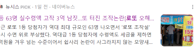 지난주 제1128회차 로또복권에서 1등 당첨자가 역대 최다인 63명으로 나오면서 조작설이 다시 불거졌습니다. 많은 사람들은 이렇게 많은 당첨자가 나오는 것이 매우 드문 일이라며, 이 상황에 의문을 품고 있습니다. 특히, 이번 회차에서도 서울 광진구 로또 판매점에서 수동 선택으로 1등 당첨자가 2명 나왔다는 사실이 조작설을 더욱 부채질하고 있습니다. 이로 인해 여러 온라인 커뮤니티와 소셜 미디어에서 논란이 일어나고 있으며, 많은 이들이 이번 회차의 결과에 대해 투명성을 요구하고 있습니다.