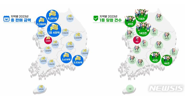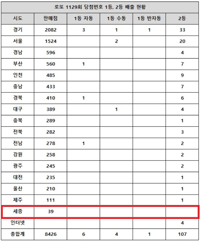 1등 당첨자를 배출한 지역은 전국 17개 시도 중 인구에 비례해 로또복권 판매점이 가장 많은 경기 2082곳 중 5곳(자동 3곳, 수동 1곳, 반자동 1곳)을 비롯해 서울 1524곳 중 1곳(수동), 부산 560곳 중 1곳(자동), 경북 410곳 중 1곳(자동), 대구 389곳 중 1곳(수동), 전남 278곳 중 1곳(자동)입니다. 이는 전국적으로 로또 복권에 대한 관심이 얼마나 큰지를 보여주는 동시에, 다양한 지역에서 당첨자가 나올 수 있음을 시사합니다.