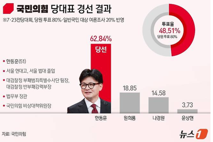 지난 24일 국민의힘 새 대표로 한동훈 후보가 선출되었습니다. 한동훈 후보는 경기 고양 킨텍스에서 열린 전당대회 대표 경선에서 당원 투표와 일반 국민 여론조사를 합산한 결과, 과반인 62.8%를 득표하며 결선투표 없이 승리를 확정지었습니다. 이번 선출로 한동훈 후보는 당 내외에서의 강한 영향력을 입증하였으며, 당의 향후 방향성과 정책적 기조에 대한 기대감이 높아지고 있습니다.