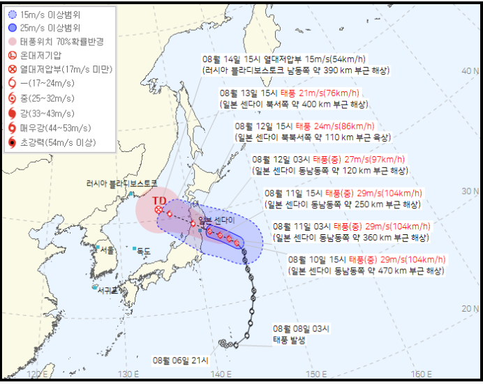 8월 10일 토요일, 태풍 5호 마리아는 강력한 폭풍역을 동반한 채 일본 동쪽 해상을 빠르게 북상하고 있습니다. 이 태풍은 현재 예상치 못한 속도로 강해지고 있으며, 다음 주 초에는 일본 도호쿠 지방에 상륙할 가능성이 높습니다. 특히 현재 태풍이 지나고 있는 해역의 해수온이 평년보다 상당히 높은 상태여서, 이러한 환경이 태풍 마리아의 세력을 급격히 강화시키는 주요 요인으로 작용하고 있습니다. 이로 인해 태풍 마리아는 도호쿠 지방에 강한 태풍 세력을 유지한 채 상륙할 것으로 보이며, 이 지역에 막대한 피해를 초래할 수 있는 잠재력을 가지고 있습니다.