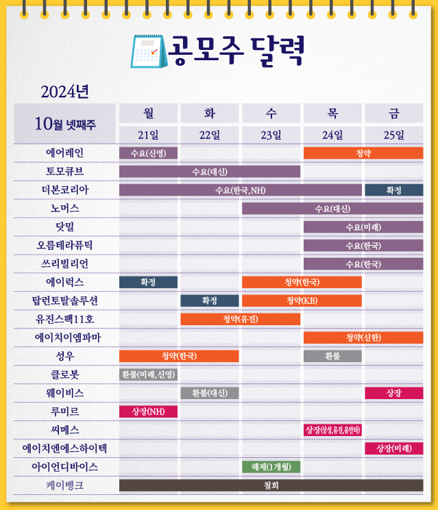 각 일정은 기업의 수요예측, 청약, 확정, 상장 등의 단계로 나누어져 있으며, 투자 계획에 참고하시기 바랍니다.