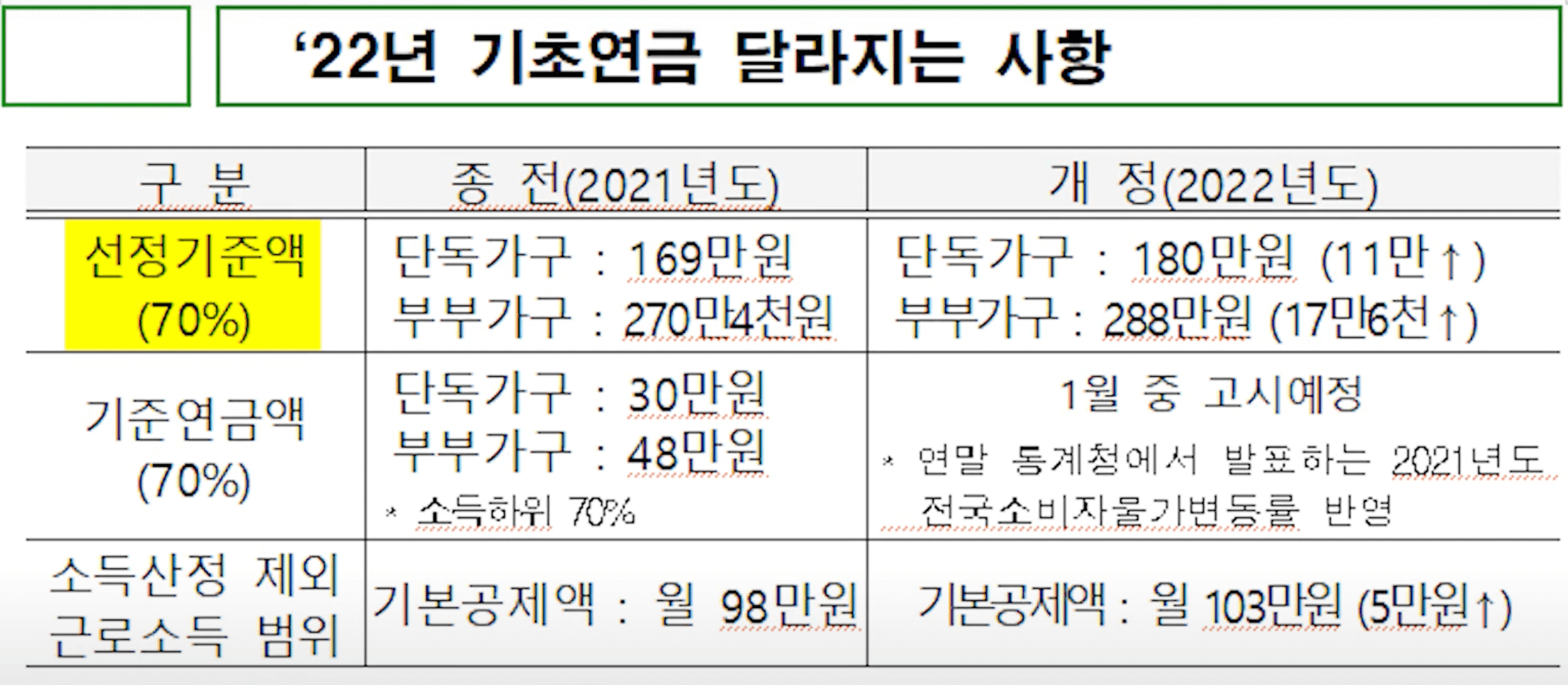 첫 번째 만 65세가 되면 다들 아시다시피 기초노령연금을 받을 수가 있습니다 상대적으로 형편이 어려우신 70% 에 어르신께 지급하고 있습니다. 2022년 선정 기준액 은 배우자가 없는 노잉 가구의 경우 월 소득인정액 80만 원 배우자가 있는 노인 가구의 경우 월 소득인정액 280만 원으로 책정됐습니다.