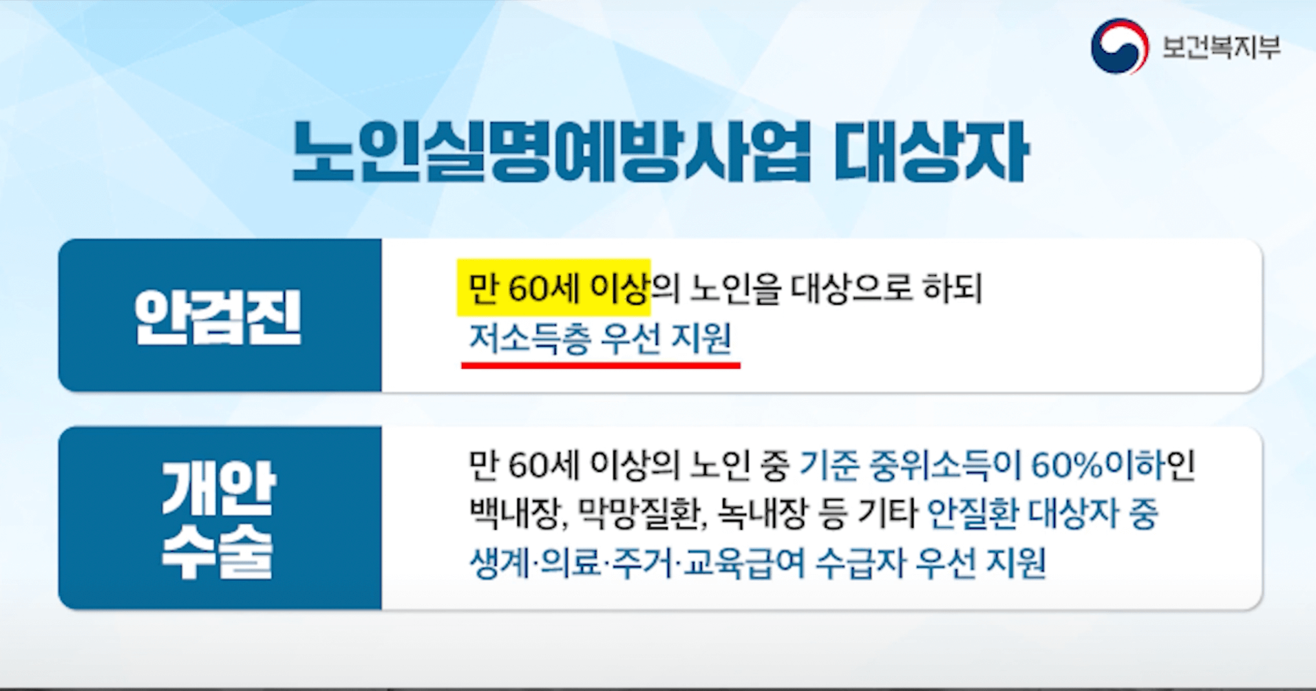 일곱 번째는 안질환 예방 검진을 지원합니다 만 60세 이상 저소득층 우선 대상으로 안과 질환 검사를 실시해 준다고 합니다. 기초생활수급자 차상위계층 한부모 가족 어르신을 대상으로 지원한다고 합니다.