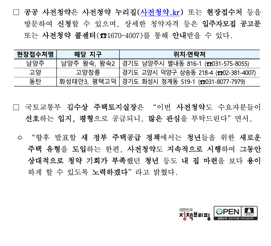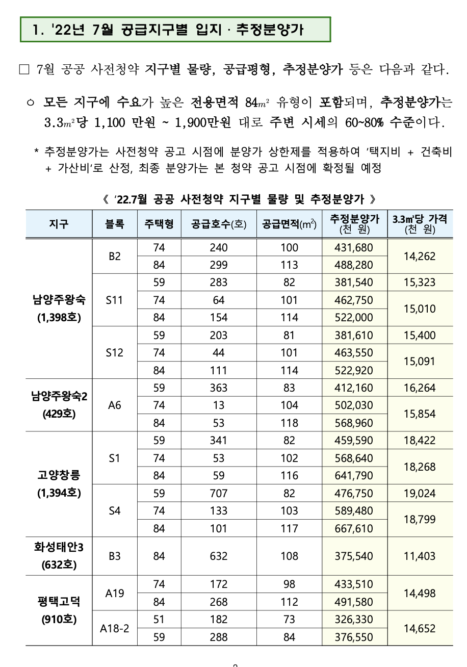 이번에 공급되는 지구는 남양주 왕숙(1398가구), 남양주 왕숙2(429가구), 고양 창릉(1394가구), 평택 고덕(910가구), 화성 태안3(632가구) 등 5개 지구 입니다. 정부에 따르면 이번 사전청약을 진행하는 모든 지구에 수요가 높은 면적인 전용면적 84제곱미터 유형이 포함되어 있으며 추정 분양가는 3,3 당 1100만~1900만 원 대로 주변 시세의 60~80% 수준이라고 합니다.