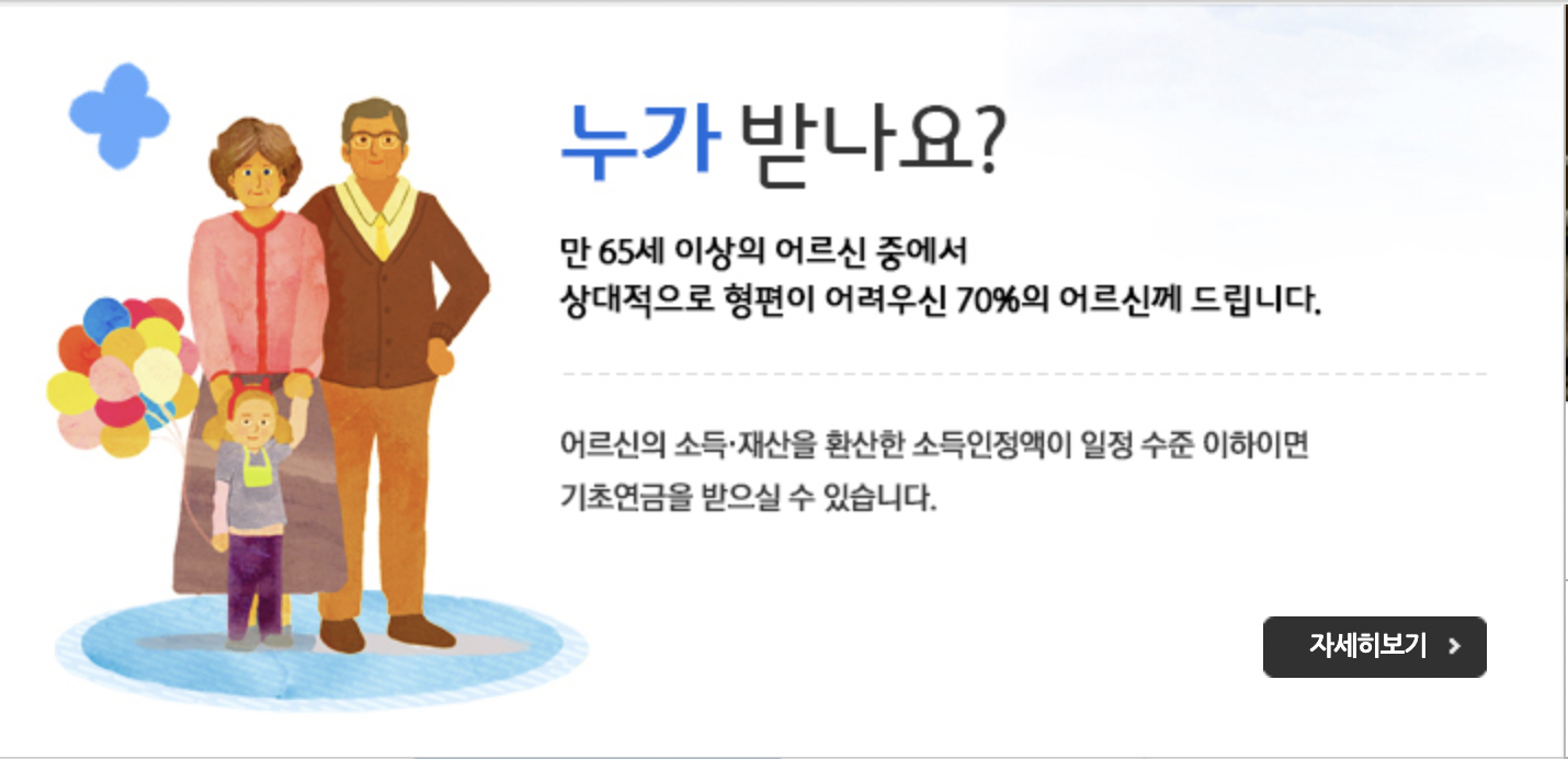 기초연금은 국가와 자녀를 위해 열심히 살아오신 우리 어르신들의 어려움을 덜어드리기 위한 제도입니다. 만 65세 이상의 어르신 중에서 상대적으로 형편이 어려우신 70%의 어르신께 드립니다.